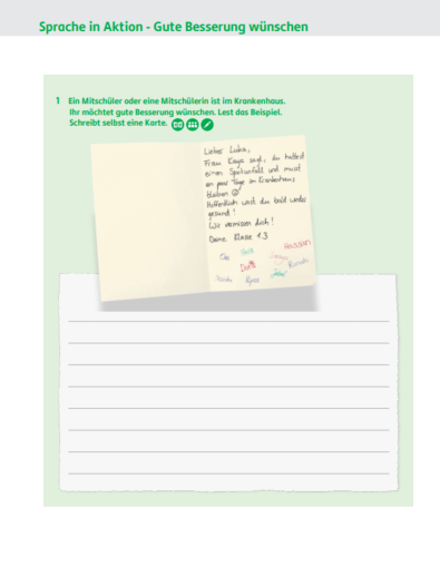 In dieser offenen Schreibförderung üben die Lernenden, eine Grußkarte für das Krankenhaus zu schreiben. Das Schwierigkeitsniveau und die Komplexität des Textes können an die Gruppe angepasst werden.