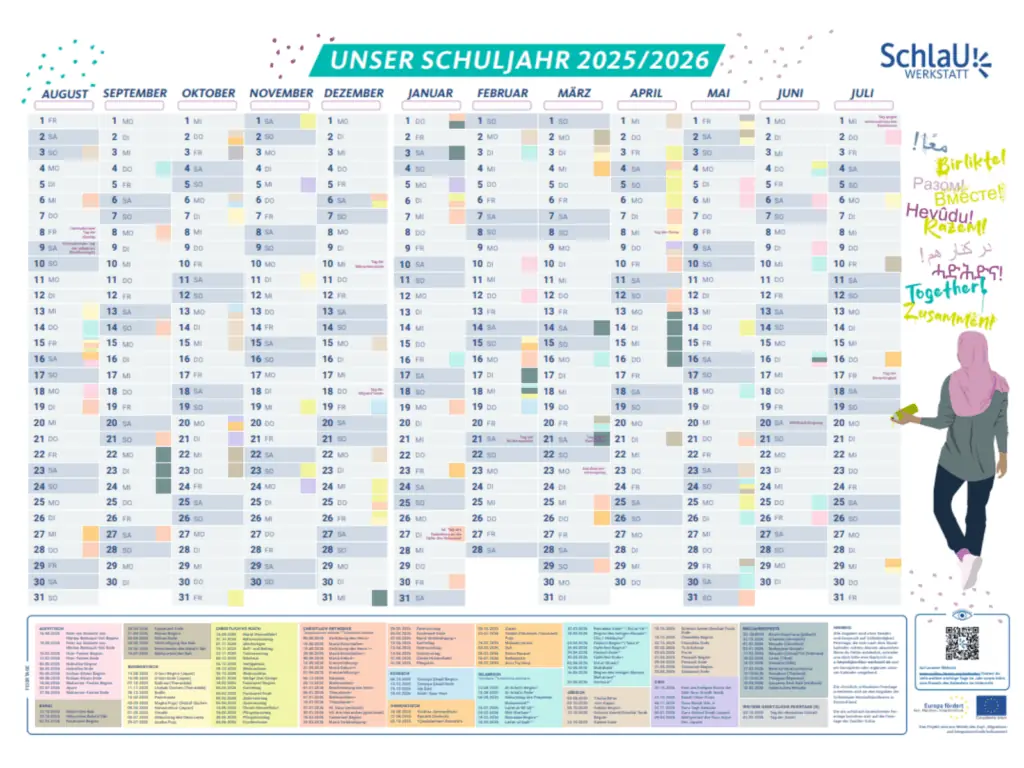 Im SchlaU-Schuljahreskalender sind neben den gesetzlichen Feiertagen religiöse Feiertage aus 12 Religionen auf einen Blick sichtbar. Außerdem haben wir zentrale Gedenk- und Aktionstage für soziale Gerechtigkeit aufgeführt, die über religiöse Bezüge hinausgehen, Lebensrealitäten abbilden und wichtige Gesprächsanlässe bieten.